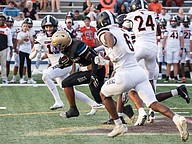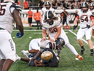 Mainland's Malcolm McArthur (bottom) recovers the fumble by Spruce Creek quarterback P.J. Miller on Friday, Sept. 12 at the Daytona Stadium. Photo by Michele Meyers