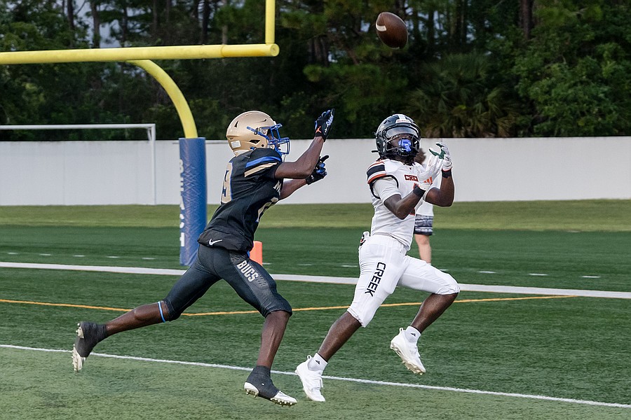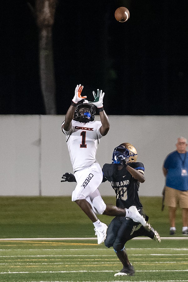 Spruce Creek's Cameron Oxendine (right) eyes the pass by quarterback P.J. Miller as Mainland's Bubba Westbrook (left) chases him down on Friday, Sept. 12 at the Daytona Stadium. Oxendine makes the catch and scores the touchdown. Photo by Michele Meyers