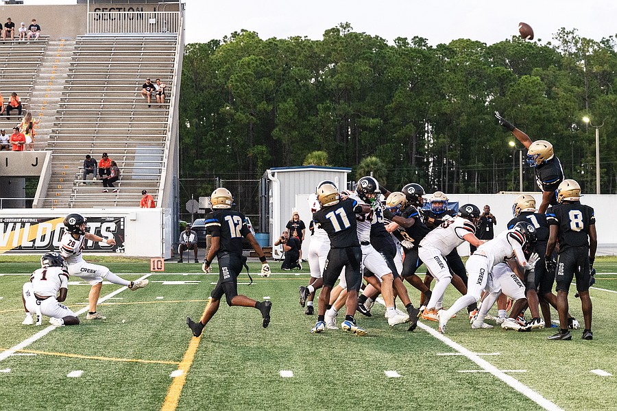 Mainland jumps to stop the kick by Spruce Creek's Blake Harrison (28) on Friday, Sept. 12 at the Daytona Stadium. Photo by Michele Meyers