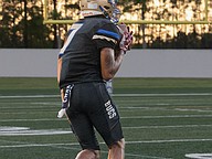 Mainland wide receiver Hajj Gentle warms up before the game against Spruce Creek on Friday, Sept. 12 at the Daytona Stadium. Photo by Michele Meyers
