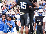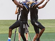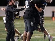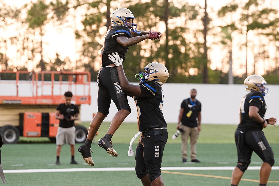 Mainland's Chevin Davis Jr. (right) lifts Chris Butler (right) after Butler's touchdown in the game against Spruce Creek on Friday, Sept. 12 at the Daytona Stadium. Photo by Michele Meyers
