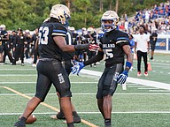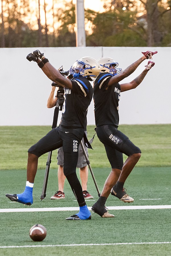 Mainland's Jaden Parks (left) and Chris Butler (right) celebrate Butler's touchdown during the game against Spruce Creek on Friday, Sept. 12 at the Daytona Stadium. Photo by Michele Meyers
