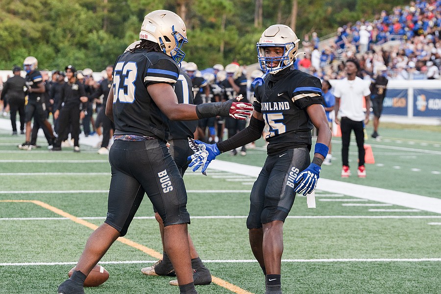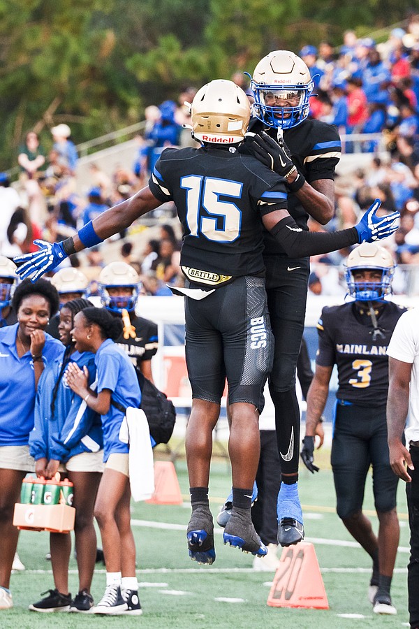 Mainland's Kadin Flores (15) and Amarion Lane (53) celebrate Flores' touchdown during the game against Spruce Creek on Friday, Sept. 12 at the Daytona Stadium. Photo by Michele Meyers