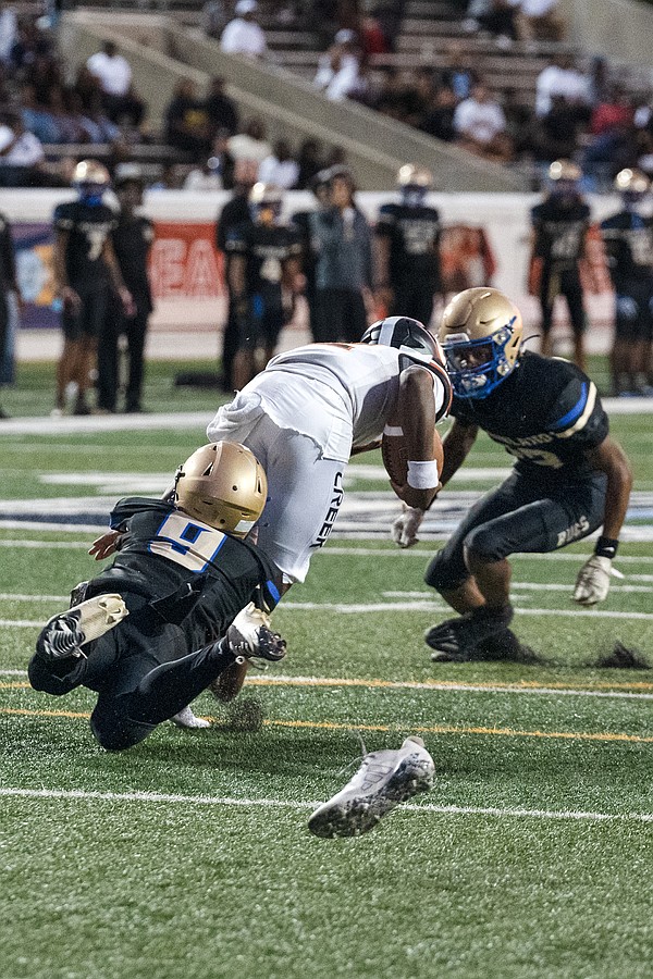 Spruce Creek quarterback P.J. Miller (center) loses a shoe as Mainland's Denzel Shropshire (left) makes the tackle with an assist by Theo Bryant (right) on Friday, Sept. 12 at the Daytona Stadium. Photo by Michele Meyers