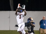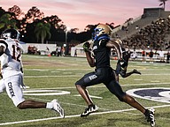 Mainland's Kadin Flores grabs the pass in the game against Spruce Creek on Friday, Sept. 12 at the Daytona Stadium. Photo by Michele Meyers