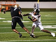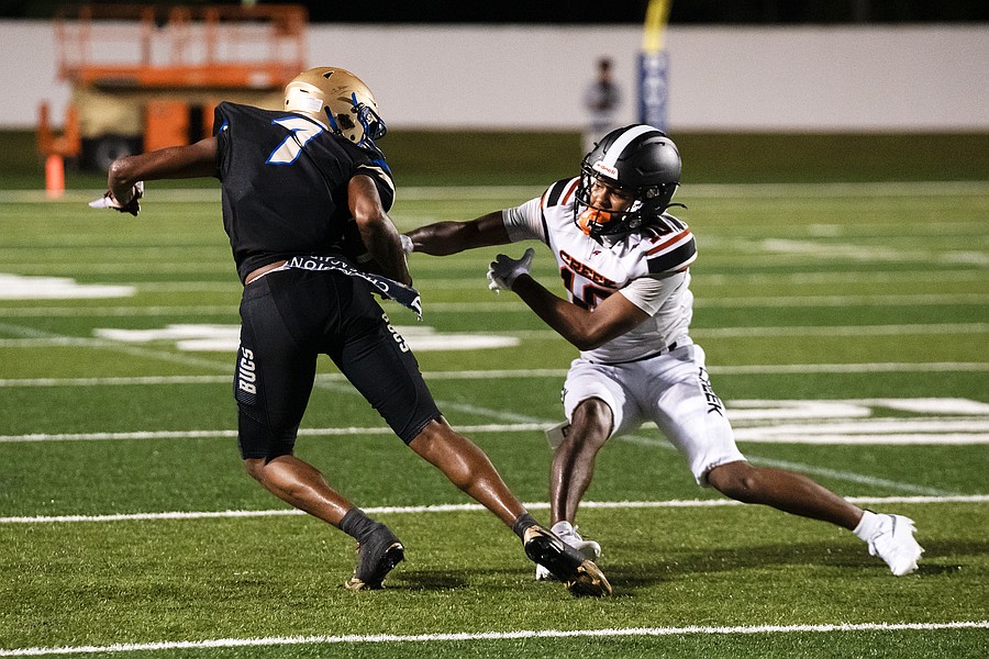 Spruce Creek's Kaden Joseph (right) interferes with Buccaneer Chris Butler's (left) catch on Friday, Sept. 12 at the Daytona Stadium. Photo by Michele Meyers