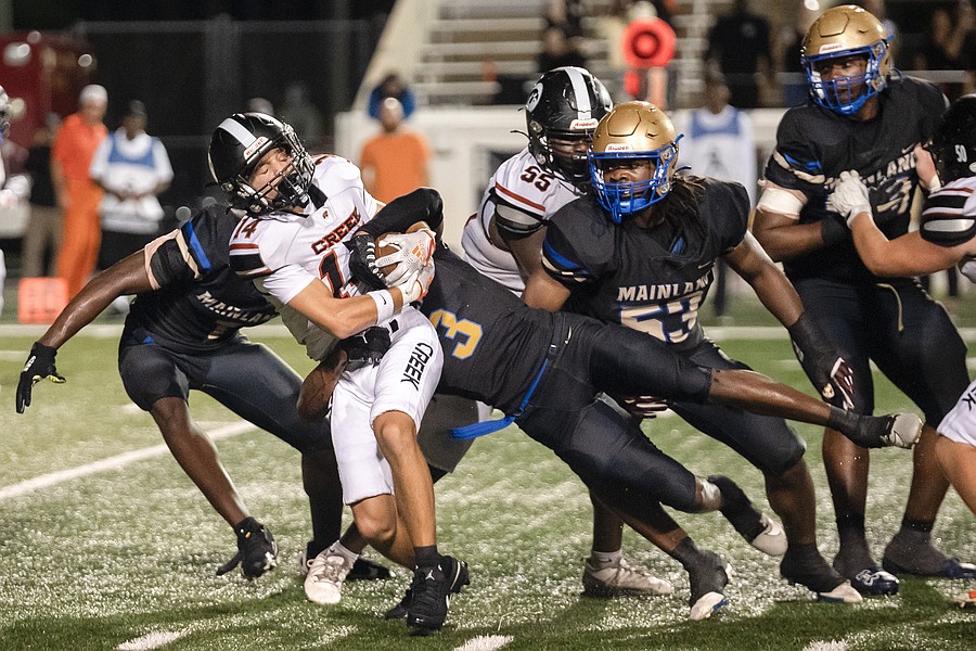 With seven seconds remaining, Mainland’s Damarion Phillips took the ensuing kickoff and sprinted 71 yards to Creek’s 13-yard line. After pass interference by the Hawks moved the ball closer, Sebastian Johnson’s pass to Chris Butler fell incomplete with Creek’s Davern Cole defending.
