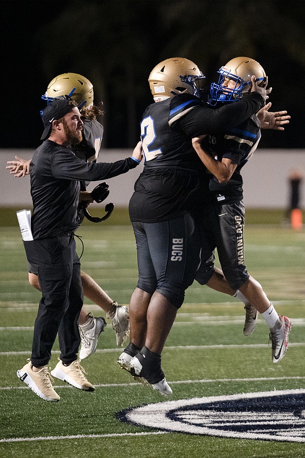 Mainland coach Ethan Simpson (left) and Tommy Bostick Jr. (center) celebrate Davdi Aponte's (right) successful field goal on Friday, Sept. 12 at the Daytona Stadium. Photo by Michele Meyers