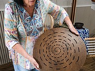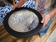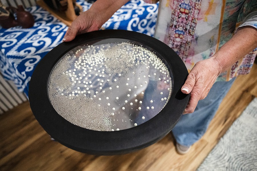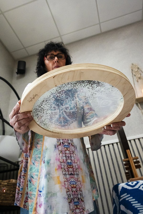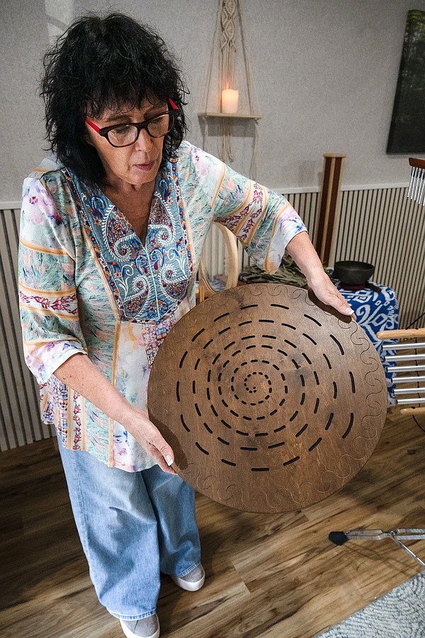Nancy DeLuca uses a two-layered ocean drum during her sound bath sessions at 7th Heaven Sound Baths. Photo by Michele Meyers