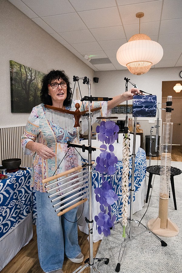 Nancy DeLuca, owner of 7th Heaven Sound Baths, shows various sound bath equipment in her studio. Photo by Michele Meyers