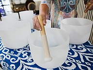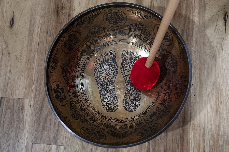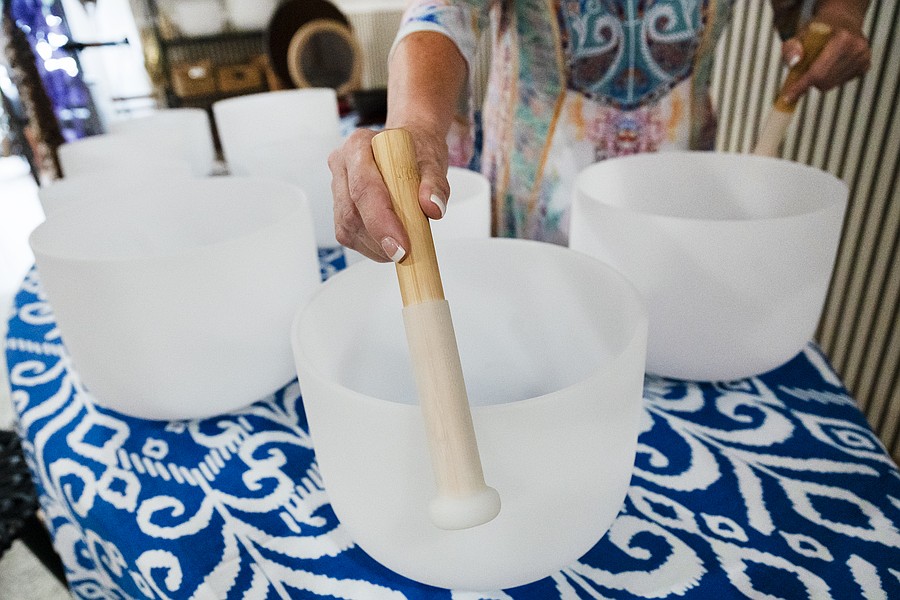 Nancy DeLuca, owner of 7th Heaven Sound Baths, uses crystal singing bowls in her sound bath studio. Photo by Michele Meyers