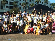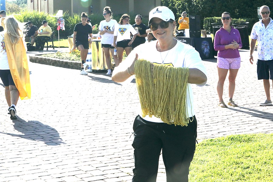 Seven laps around the lake at Central Park equals five kilometers, or 3.1 miles. Each time participants circled the lake, they received a string of gold beads. Gold is the color symbolizing childhood cancer awareness.