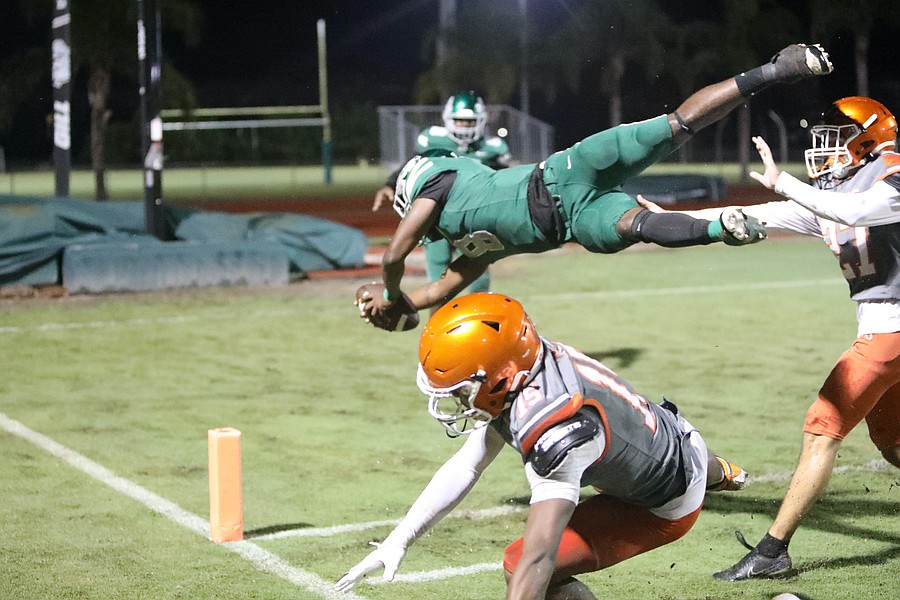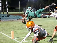 FPC quarterback La'Darius Simmons dives over University's Aden Andrews into the end zone to score the Bulldogs' first touchdown in a 38-7 victory on Sept. 26. Photo by Brent Woronoff