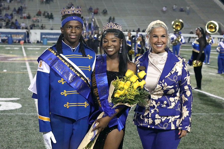 Mainland Homecoming King and Queen of 2025-2026: Javon Estes and Aysia Thompson with Principal Melissa Fraine at halftime of the Bucs' Homecoming game on Sept. 25. Photo by Brent Woronoff