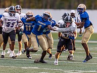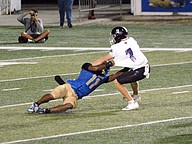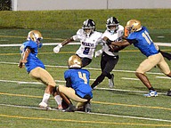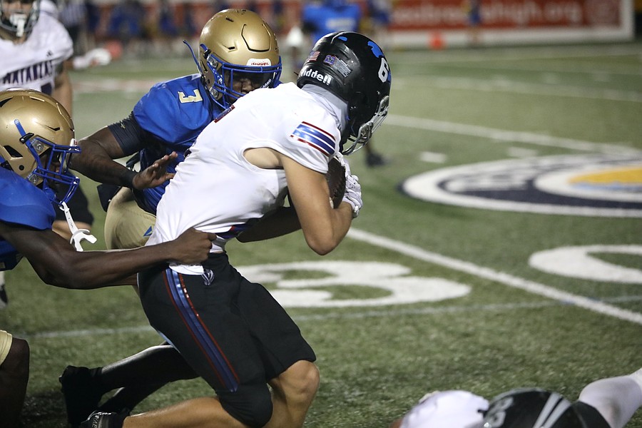 Mainland defenders tackle Matanzas receiver Thomas Larywon after the catch. Photo by Brent Woronoff