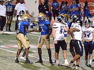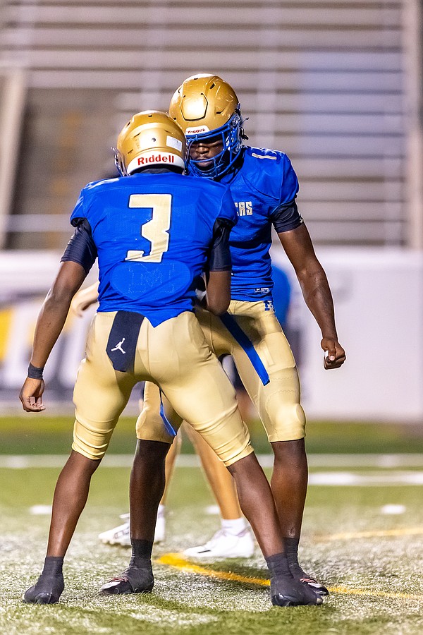 Mainland linebackers Tamaj Woodard (3) and Dennis King (1) celebrate a defensive stop. Photo by Keishia McLendon