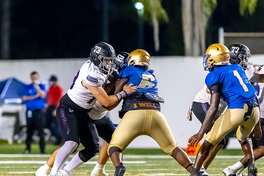 Matanzas offensive linemen Sean Liston (73) and Logan Walker (52) block Mainland's Ayden Lewis (66). Photo by Keishia McLendon