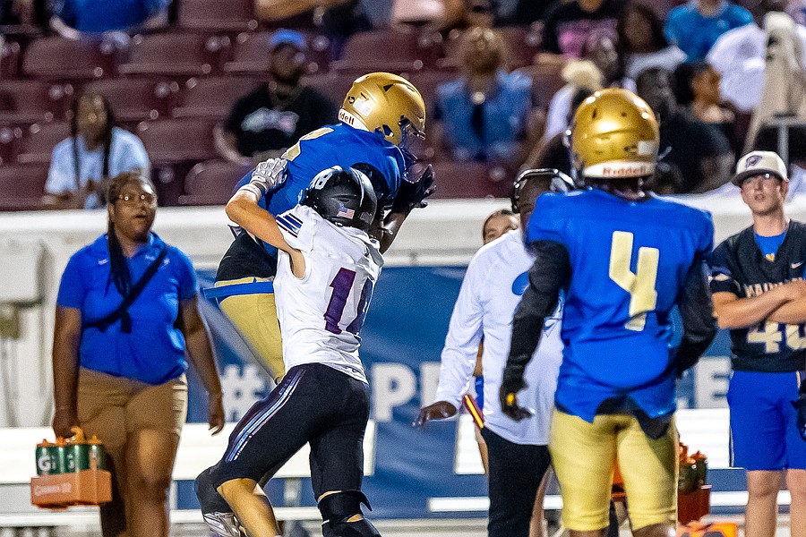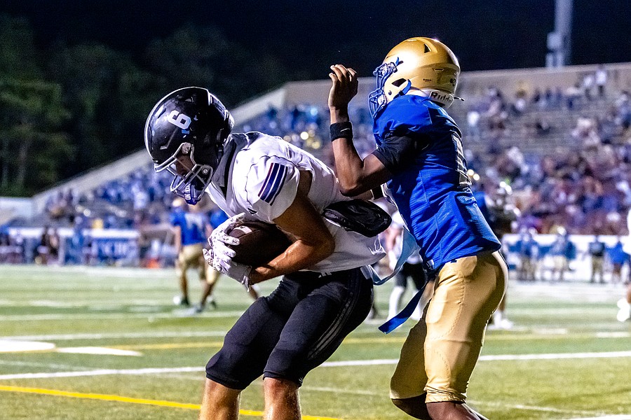 Matanzas receiver Thomas Larywon (6) catches a touchdown pass in front of Mainland's Theo Bryant. Photo by Keishia McLendon