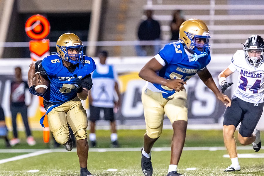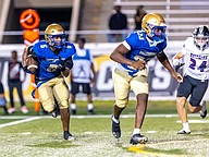 Mainland's Braylyn Simmons (6) runs behind blocker Josh Dudley (23). Photo by Keishia McLendon