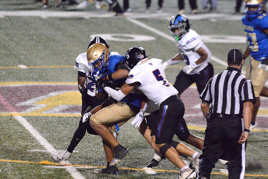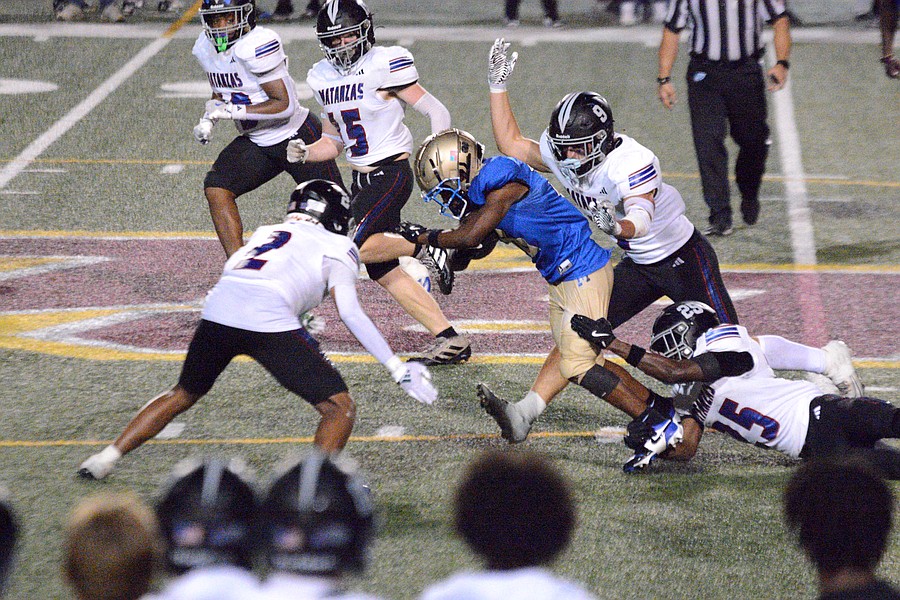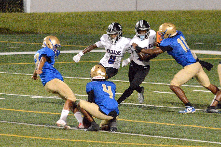 Kadin Flores is swarmed by Matanzas' Ladarien Baker and Jezeriah McCoy (25). Photo by Brian McMillan