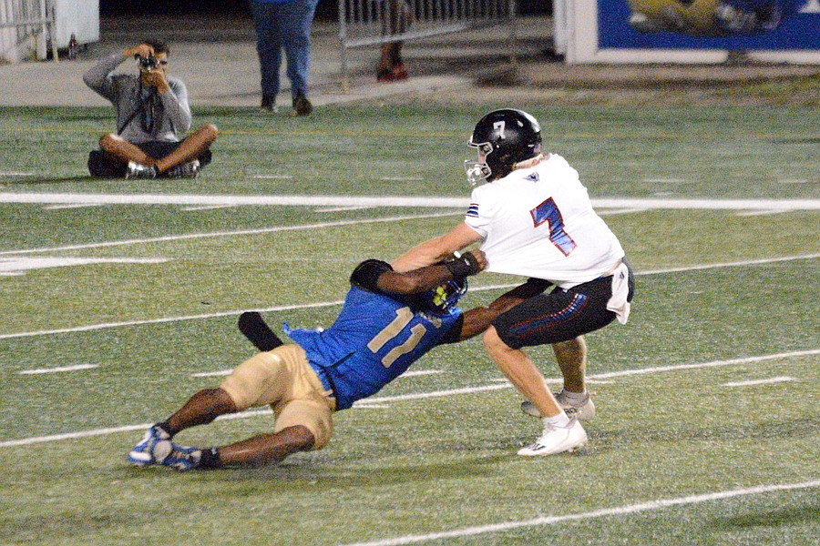 Matanzas linebacker Rylee Roberts chases down Mainland quarterback Sebastian Johnson. Photo by Brian McMillan