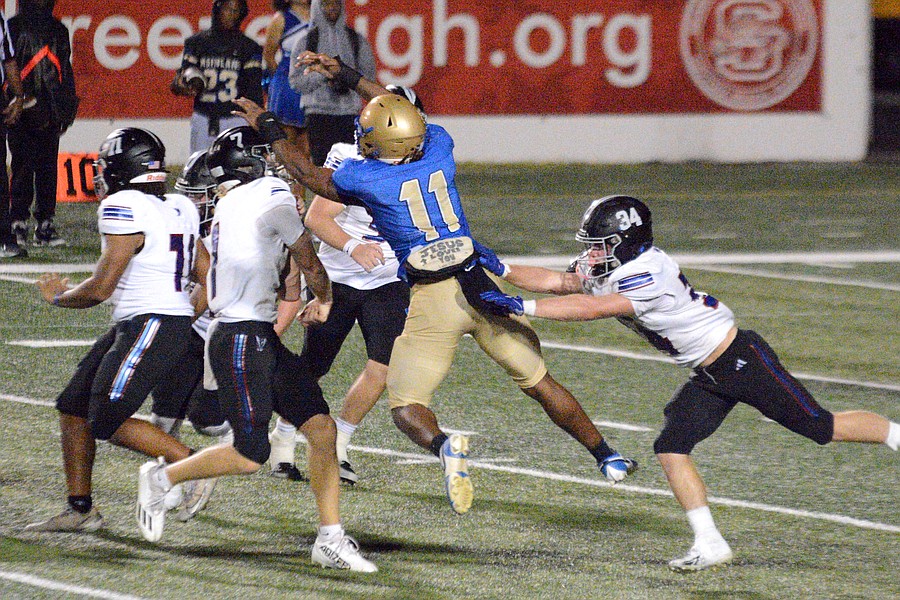 Mainland's Shawn Holmes (11) attempts to block a pass. Photo by Brian McMillan