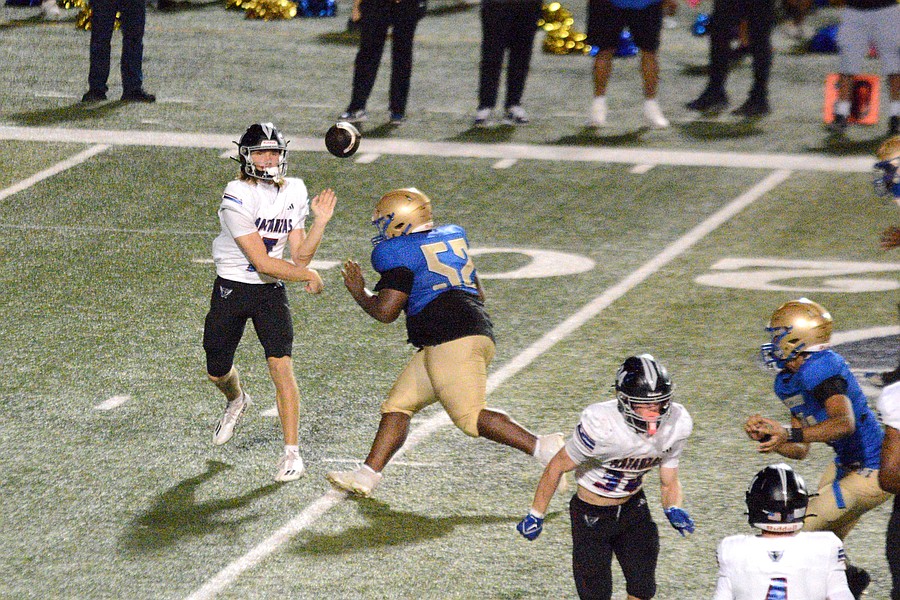 Matanzas quarterback Cole Walker gets a pass off ahead of Mainland's Tommy Bostick Jr. (52). Photo by Brian McMillan