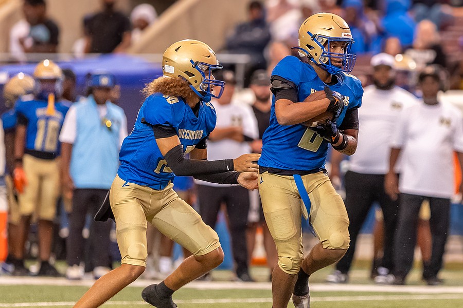 Mainland running back Braylyn Simmons (right) takes a handoff from quarterback Sebastian Johnson. Photo by Keishia McLendon
