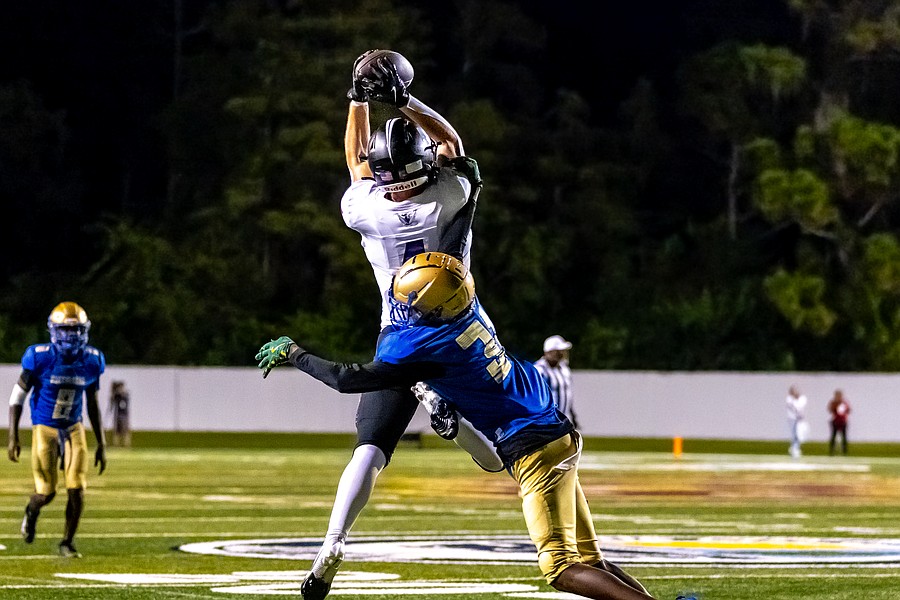 Matanzas receiver Ladarien Baker reaches for a low pass as Mainland's Denzel Shropshire covers. Photo by Keishia McLendon