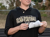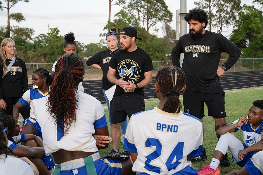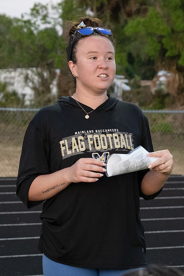 Former Mainland flag football quarterback Alexa Wilson currently coaches the Mainland offense. She addresses the team following the win against the Atlantic Sharks in the first game of the Five Star Conference flag football tournament on Monday, March 30. Photo by Michele Meyers
