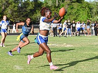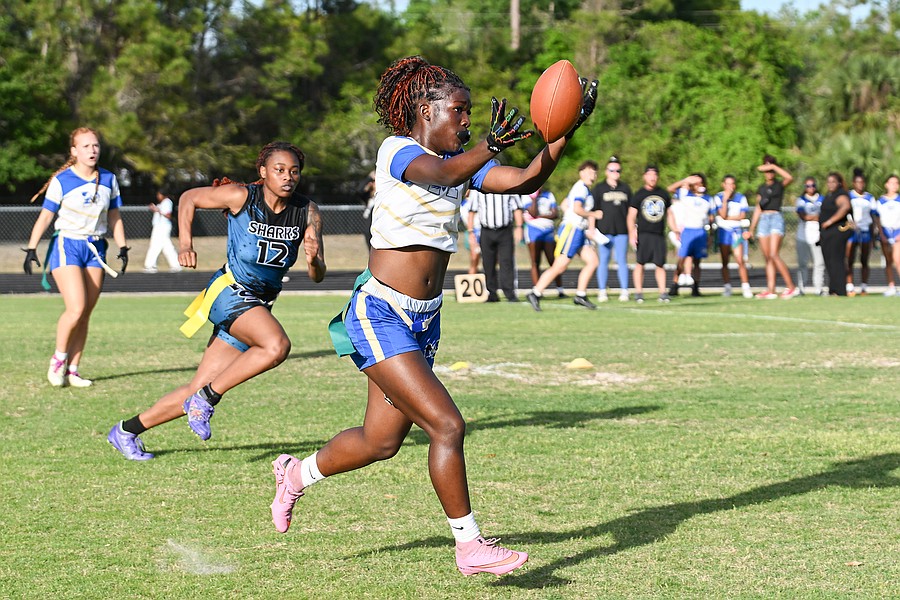 Mainland running back Natalie "Uno" Williams (center) grabs a pass in the first game of the Five Star Conference flag football tournament against Atlantic on Monday, March 30. Photo by Michele Meyers