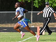 Mainland running back Natalie "Uno" Williams scores in the first game of the Five Star Conference flag football tournament against Atlantic on Monday, March 30. Photo by Michele Meyers