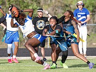 Mainland's Natalie Williams (2), Natalie "Uno" Williams and Zariah Blue (10) chase down Atlantic quarterback Terrianna Ammons (13) in the first game of the Five Star Conference flag football tournament on Monday, March 30. Photo by Michele Meyers