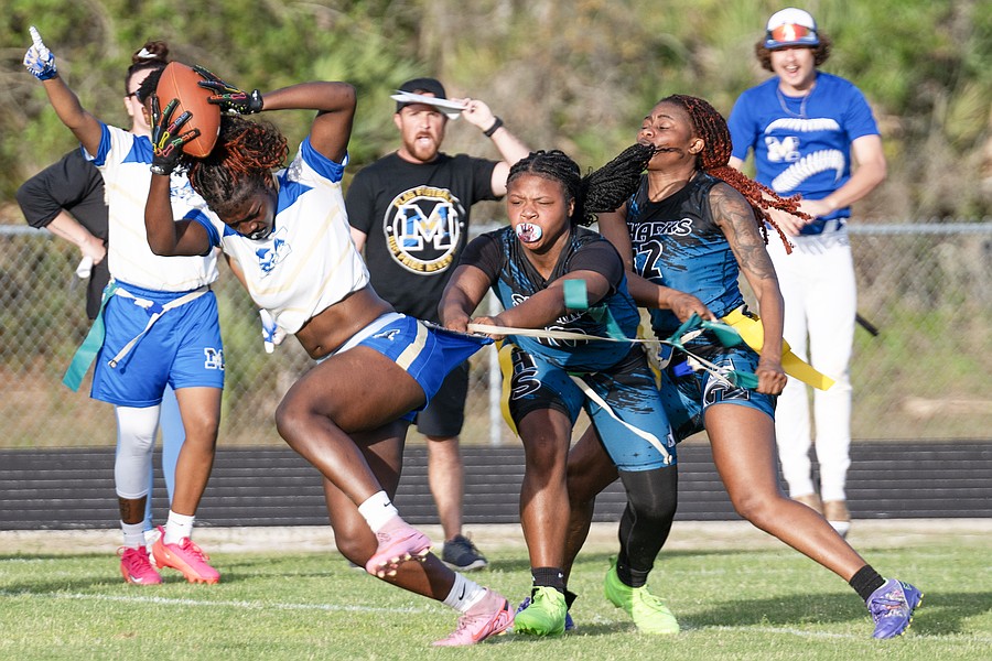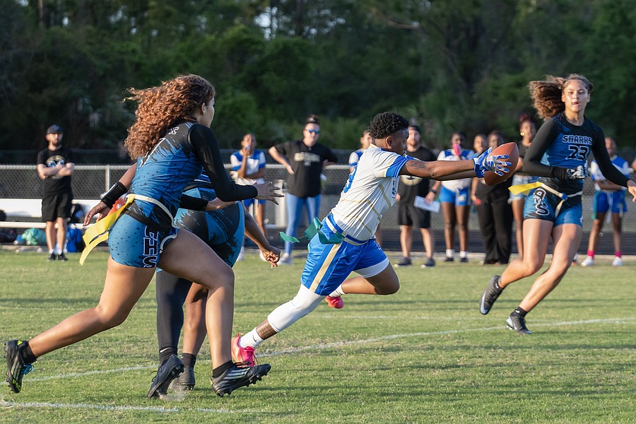 Mainland receiver Terri Williams reaches for a first down before Atlantic players Delilah Fletcher (left) and Santana Dixon (right) pull her flag in the first game of the Five Star Conference flag football tournament on Monday, March 30. Photo by Michele Meyers