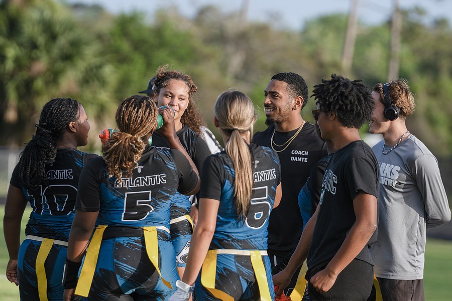 Atlantic assistant flag football coach Dante Jones laughs with his players during a timeout in the first game of the Five Star Conference flag football tournament against Mainland on Monday, March 30. Photo by Michele Meyers