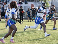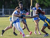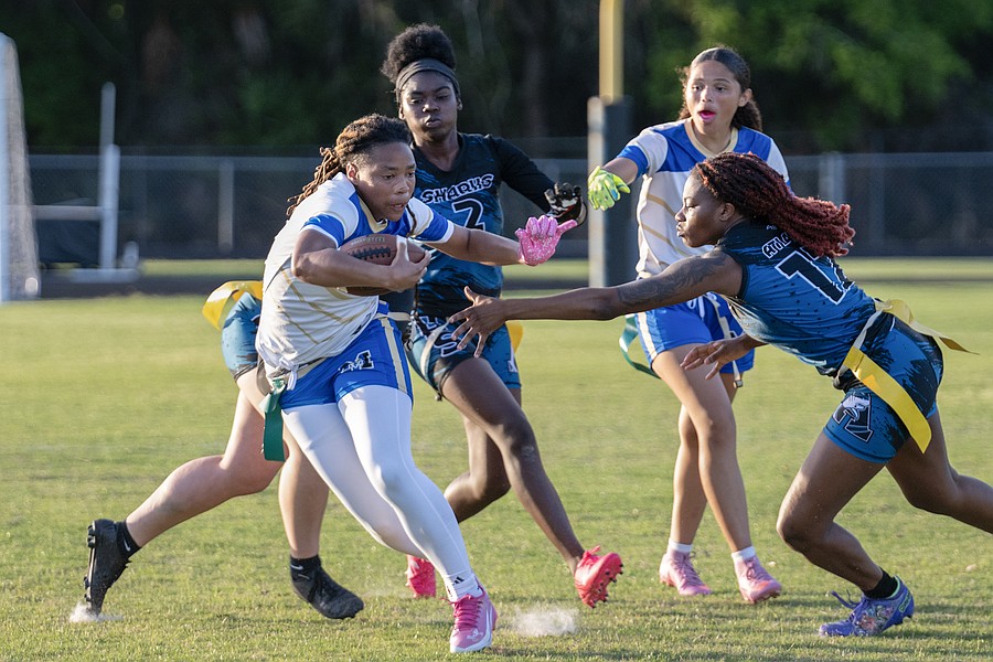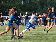 Mainland quarterback Natalie Williams (left) works her way through three Atlantic defenders in the first game of the Five Star Conference flag football tournament on Monday, March 30. Photo by Michele Meyers
