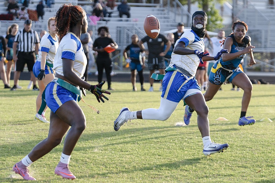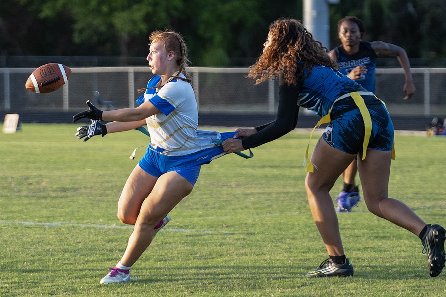 Mainland wide receiver Zariah Blue (center) tosses the ball to Natalie (Uno) Williams (left) in the first game of the Five Star Conference flag football tournament on Monday, March 30. Photo by Michele Meyers