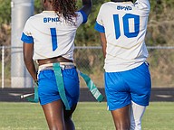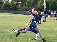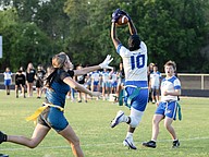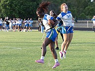 Another touchdown for Mainland running back Natalie "Uno" Williams (left) in the first game of the Five Star Conference flag football tournament against Atlantic on Monday, March 30. Photo by Michele Meyers