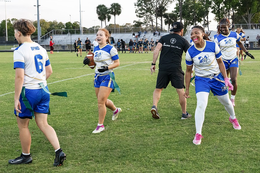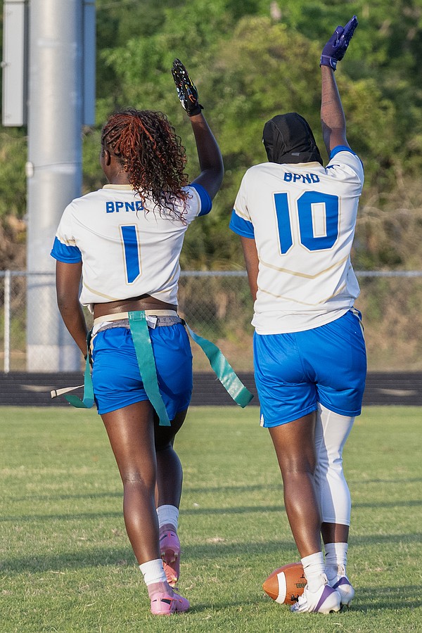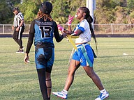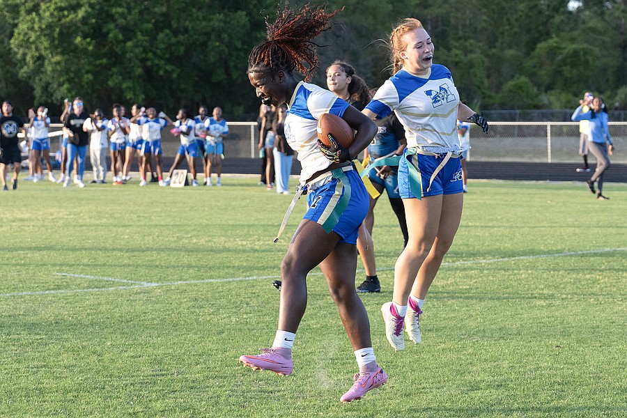 Mainland running back Natalie "Uno" Williams (1) and wide receiver Zariah Blue (10) celebrate a first down in the first game of the Five Star Conference flag football tournament on Monday, March 30. Photo by Michele Meyers