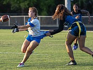 A Mainland's Hannah Tucker (left) tosses the ball before Atlantic's Delilah Fletcher (right) pulls her flag in the first game of the Five Star Conference flag football tournament on Monday, March 30. Photo by Michele Meyers