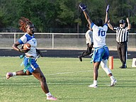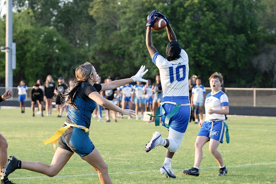 Atlantic players cannot stop the touchdown by Mainland wide receiver Zariah Blue (10) in the first game of the Five Star Conference flag football tournament on Monday, March 30. Photo by Michele Meyers