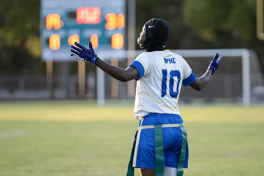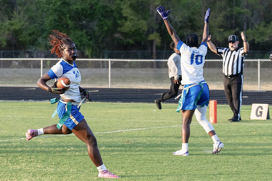 Mainland wide receiver Zariah Blue (10) is called for her touchdown celebration in the first game of the Five Star Conference flag football tournament against Atlantic on Monday, March 30. Photo by Michele Meyers