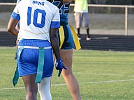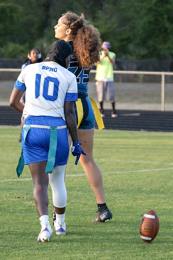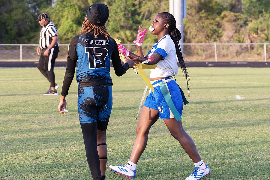 Mainland captain Shamya Scott (right) returns Atlantic quarterback Terriana Ammons' belt following Scott's back-to-back sacks in the first game of the Five Star Conference flag football tournament on Monday, March 30. Photo by Michele Meyers