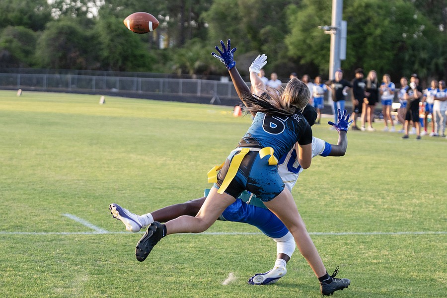 Mainland senior Jada Rawls (front right) ends up wth the interception in the first game of the Five Star Conference flag football tournament against Atlantic on Monday, March 30. Photo by Michele Meyers