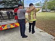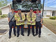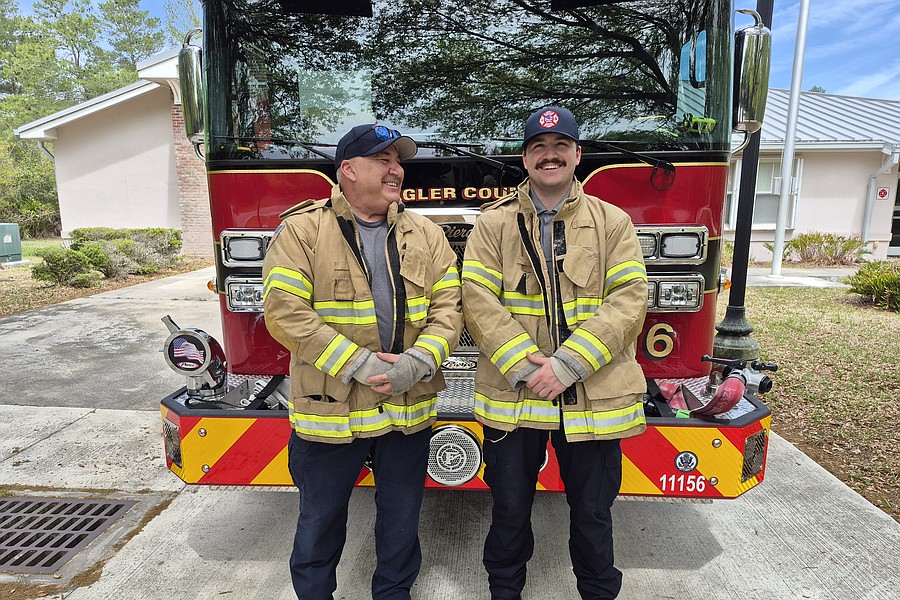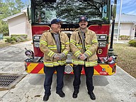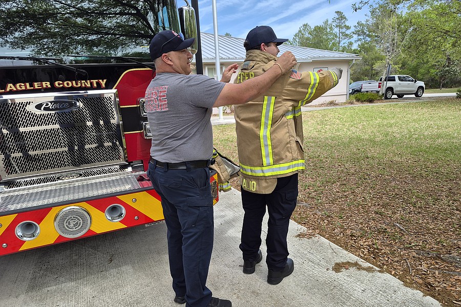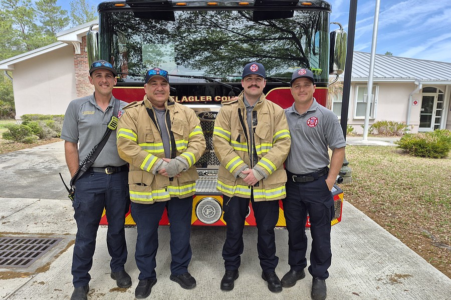 Flagler County Fire Rescue Firefighter Paramedic Chris Calio retired on April 1, no joke, and had the privilege of spending the day with his son, Nick Calio – brand new to the department at Fire Station 16 on the Volusia County border. Also on shift were Chris Calio’s best friends: Noah Hunt and Jake Gonzalez.