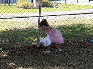 A young gathers eggs during the Easter egg hunt. Photo by Suzanne McCarthy
