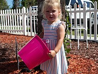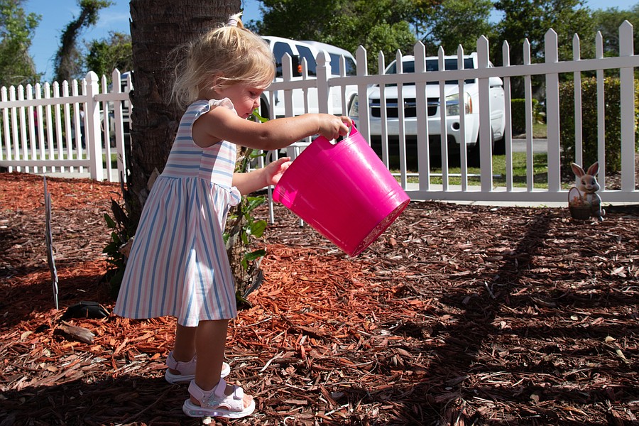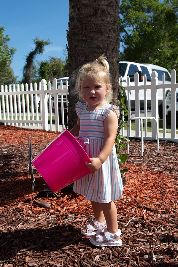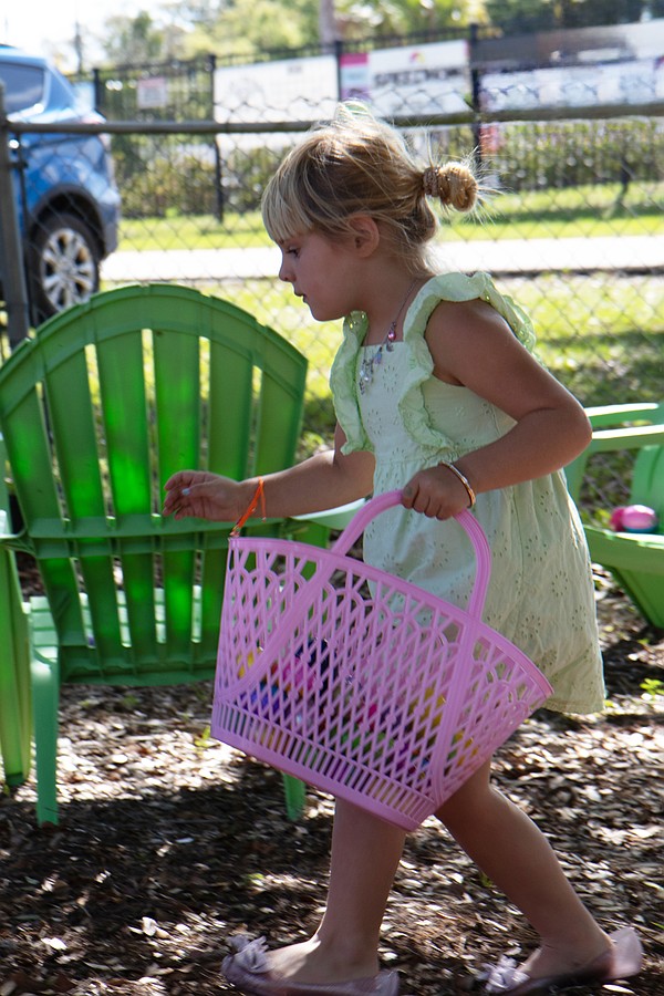 Iris Lucas, 22 months, carries her basket during the Easter egg hunt at Tomoka United Methodist Church. Photo by Suzanne McCarthy