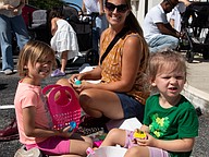 Alena, 4 and and Aubrey, 2 with their mother Thea, open their eggs after the Tomoka United Methodist Church Easter Party and Egg Hunt. Photo by Suzanne McCarthy