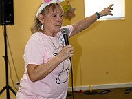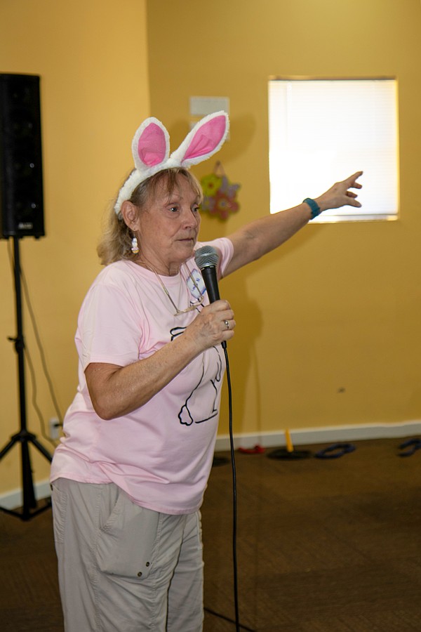 Church volunteer and long-time organizer Linda Neely calls for the children to line up for the egg hunt. Photo by Suzanne McCarthy