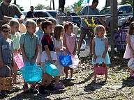 Kindergarteners go in search of eggs. Photo by Suzanne McCarthy